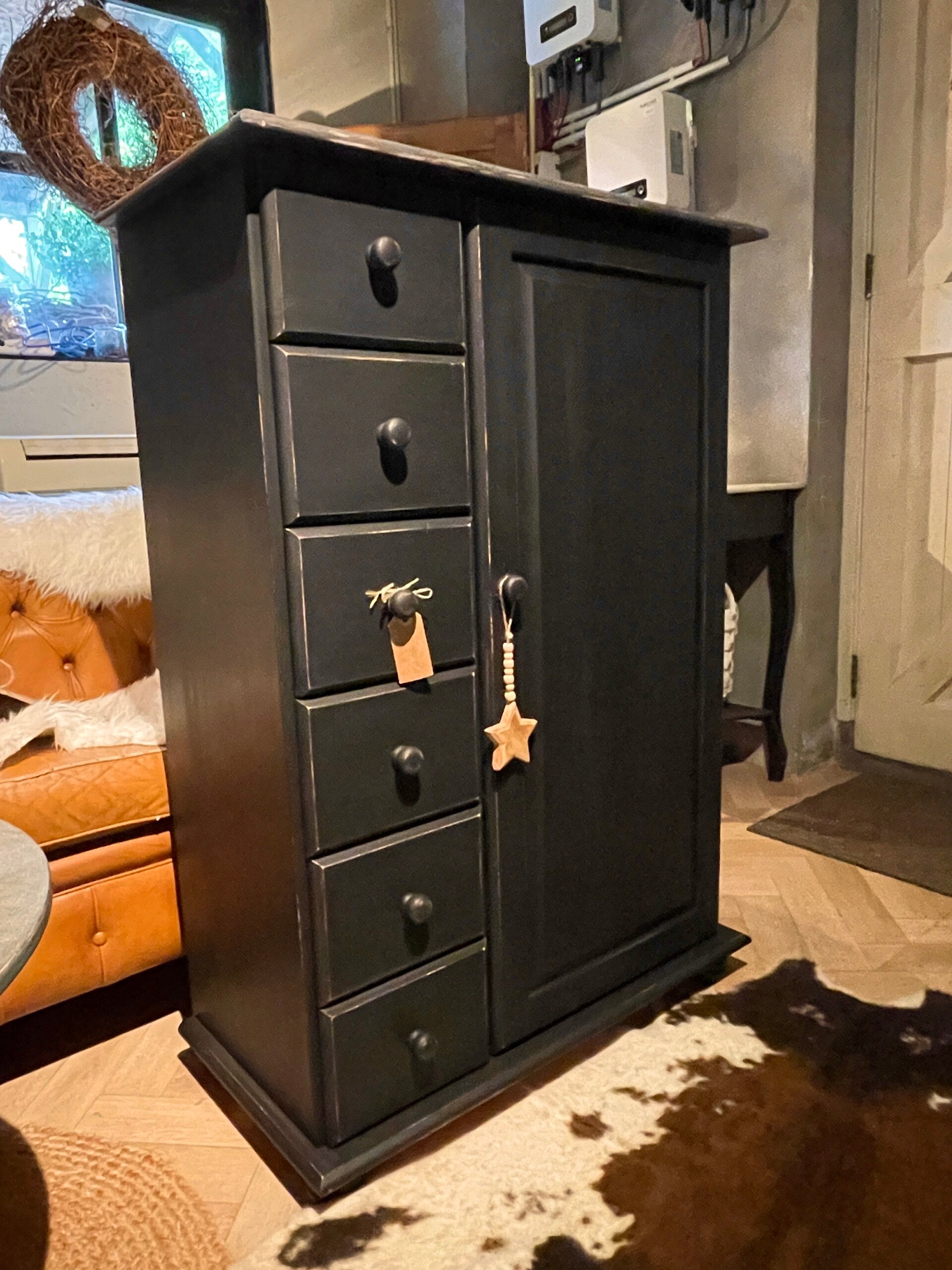Meidenkast offblack met 6 laadjes en een legplank. De randjes zijn doorgeschuurd.