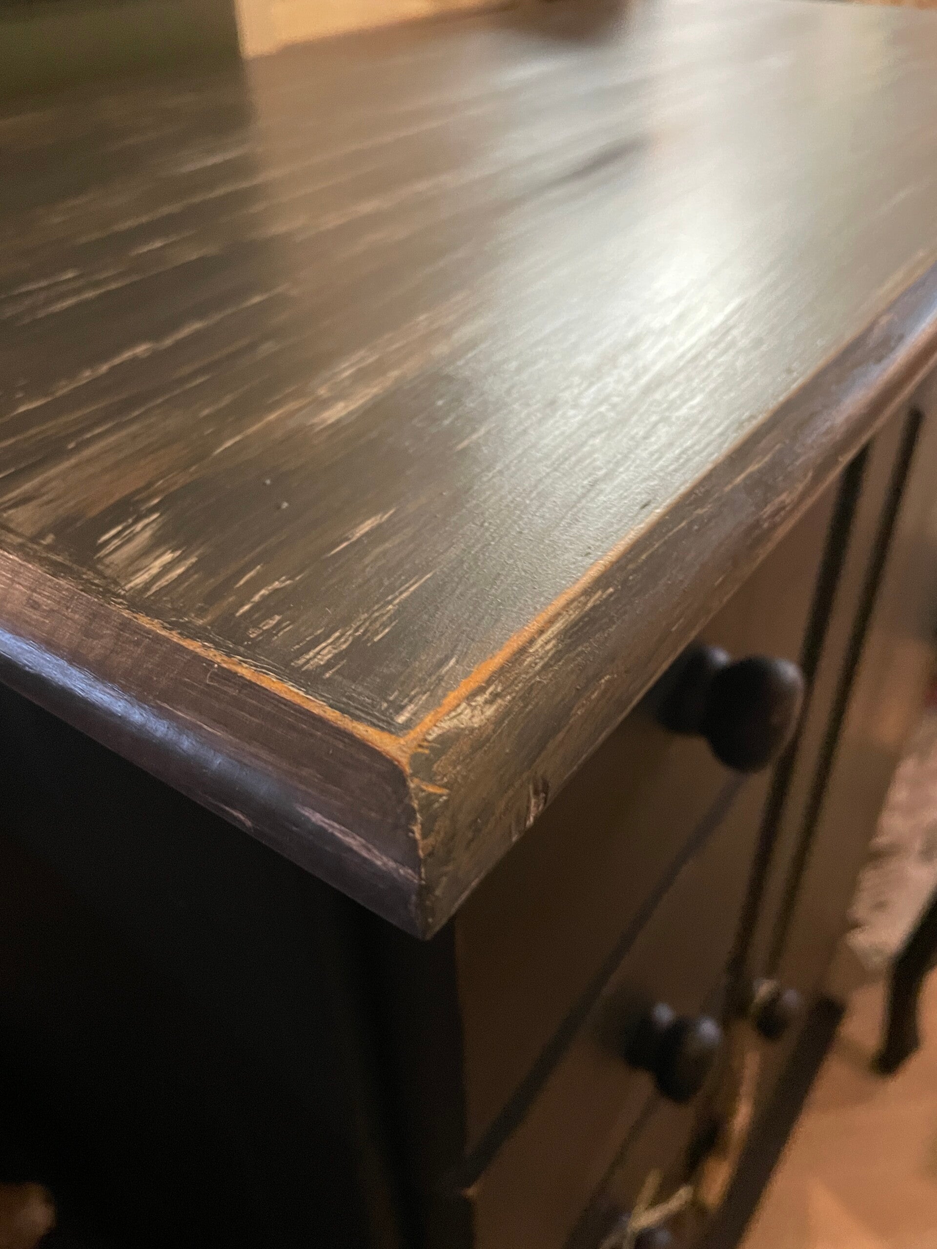 Het bovenblad is oldbrown gemeleerd afgewerkt met een transparante lak.