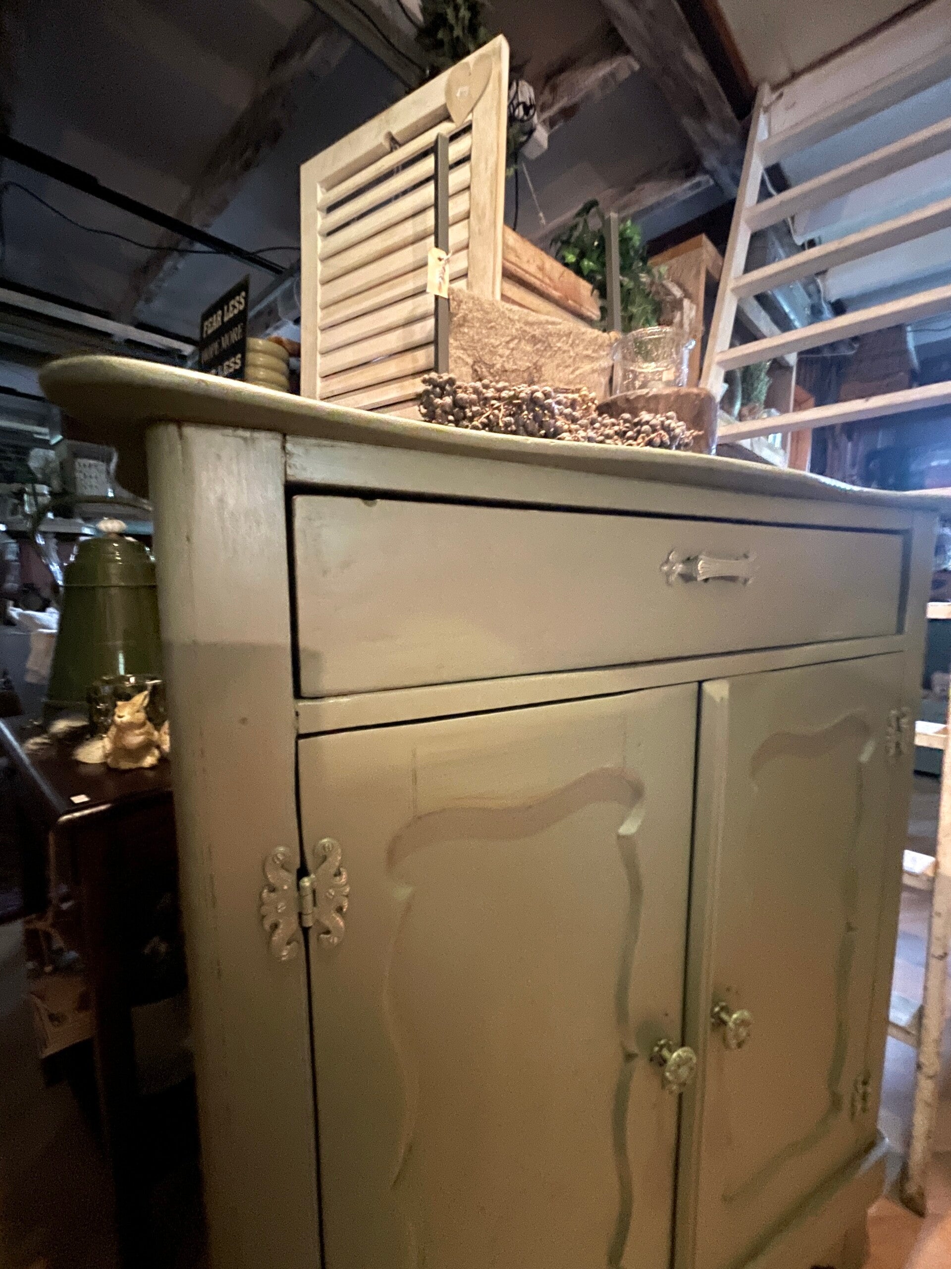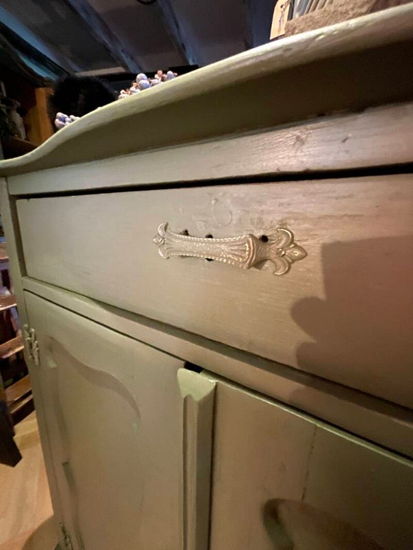Met een lade met 2 sierlijke oude grepen en een legplank in de kast.