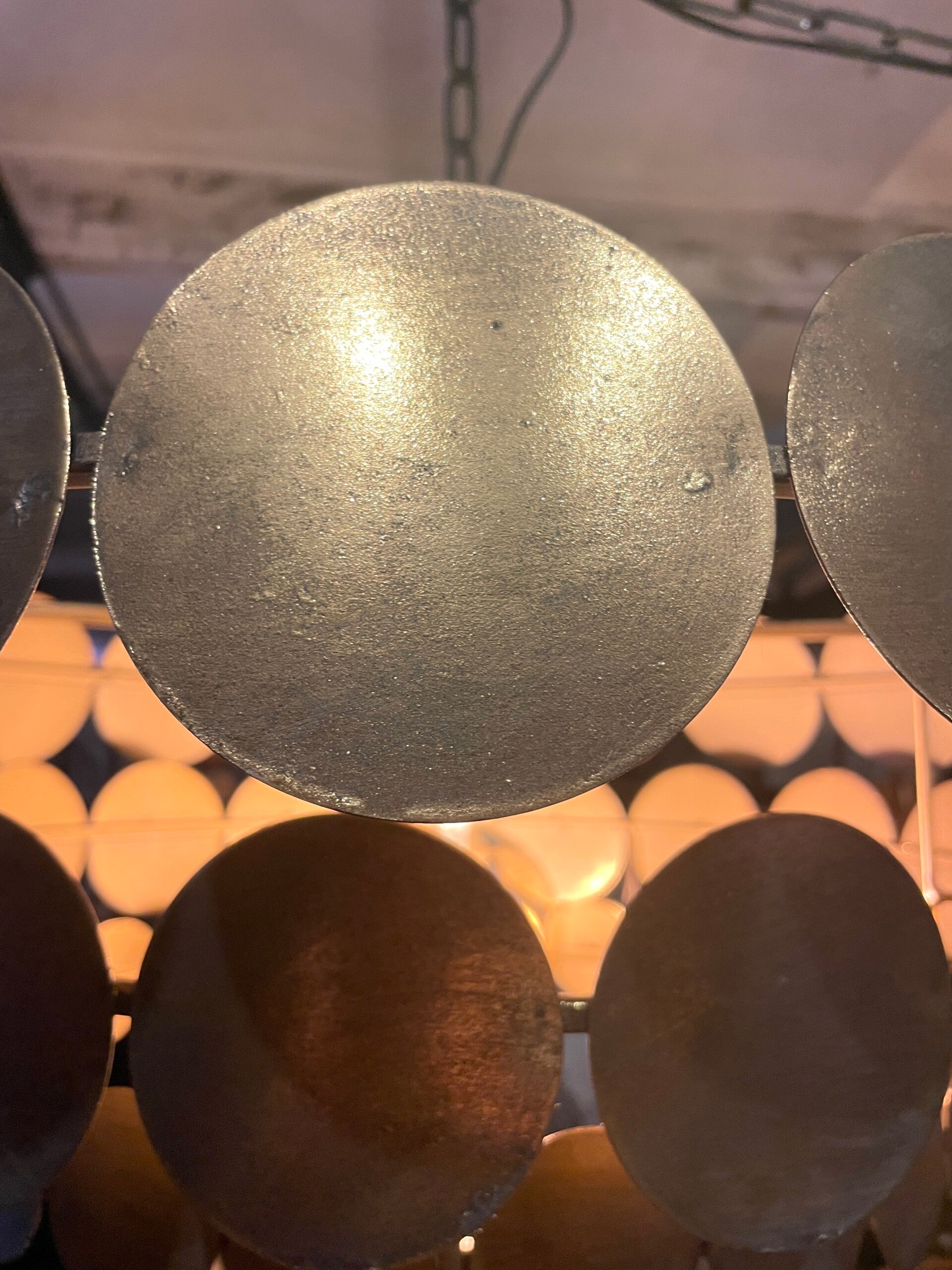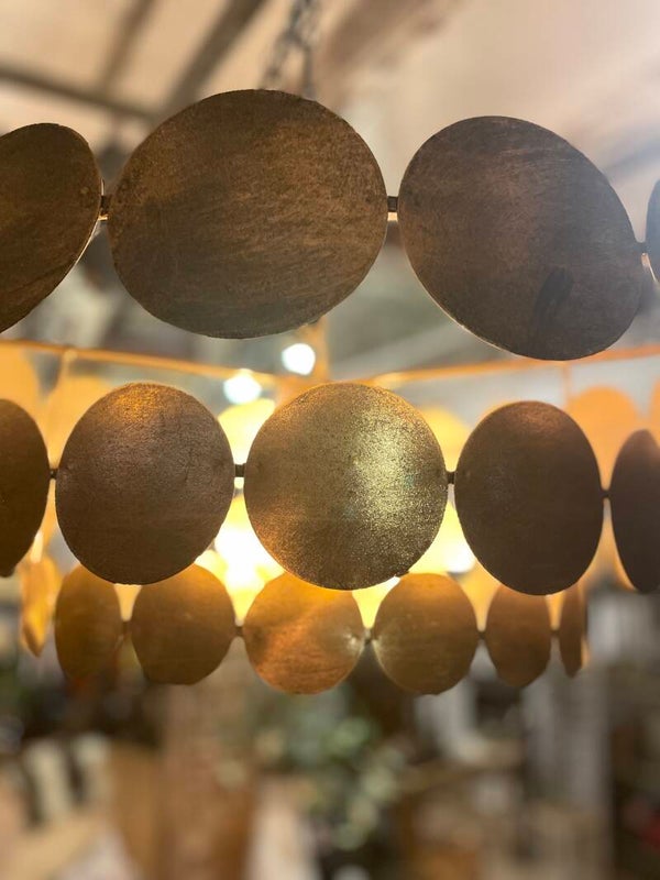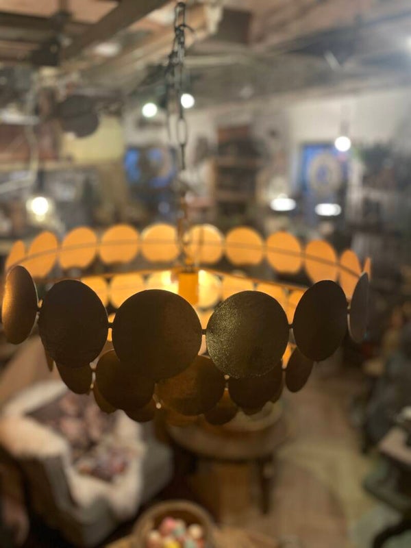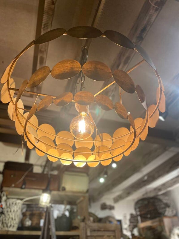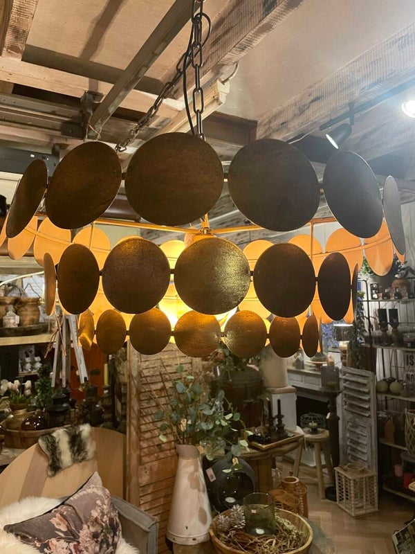 Doorsnede 60 cm, hoogte 30 cm De ketting is ong. 1 meter, dus op elke gewenste hoogte te hangen.