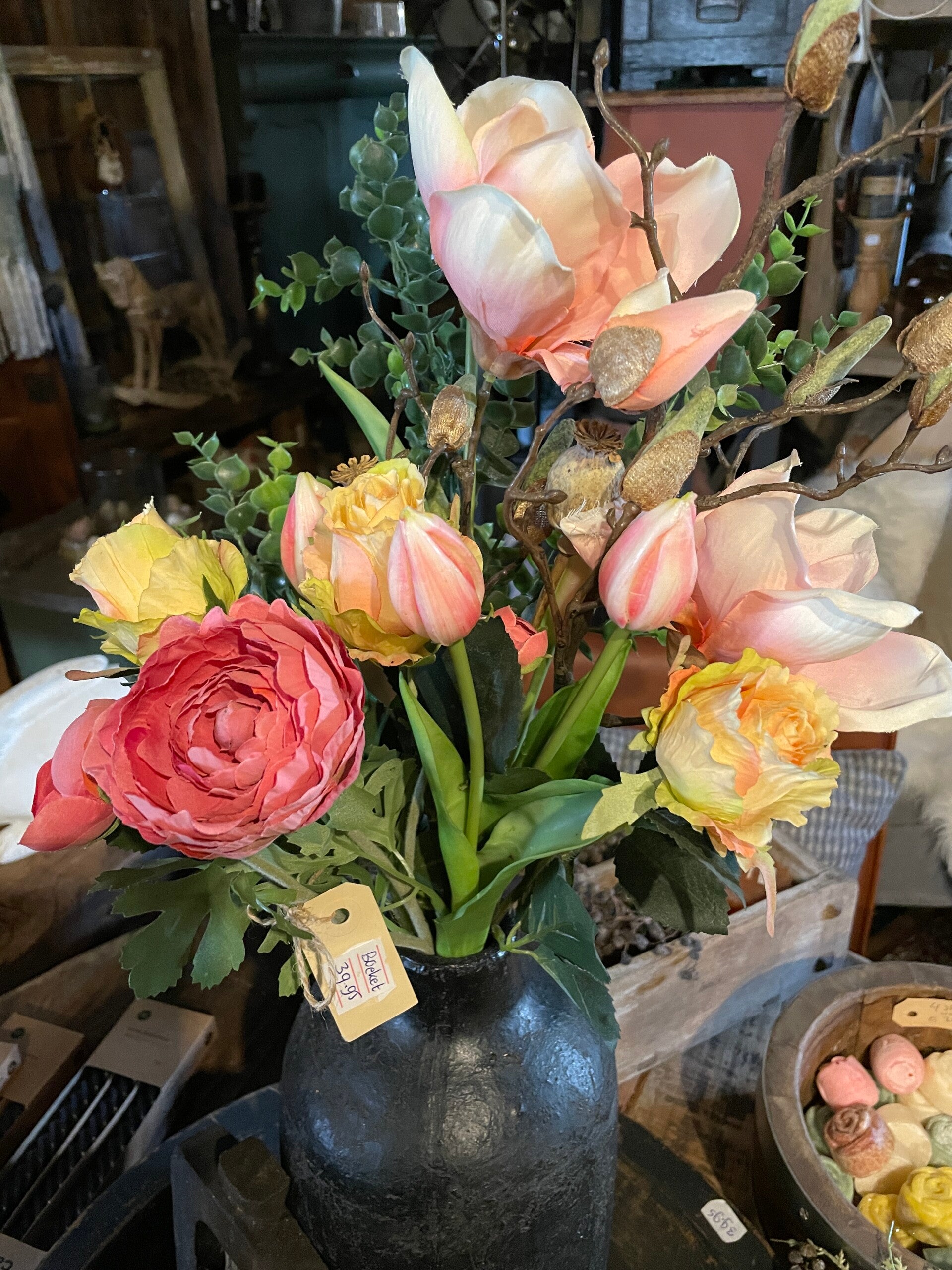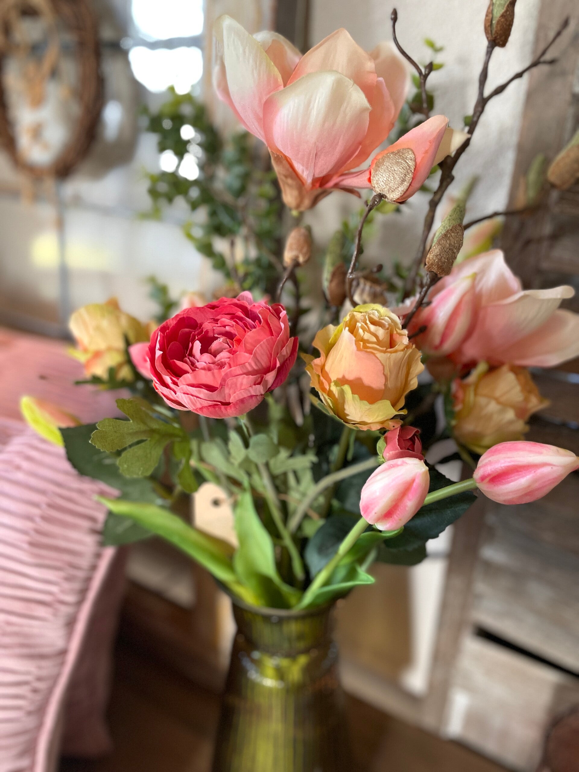 Prachtig kant en klaar boeket van real touch tulpen/rozen/anemoon/magnolia met een groenetak in een diverse mix rose/zalm/groen kleur Geeft direct het voorjaarsgevoel en brengt wat kleur in huis! Ze staan altijd in bloei en je hebt er elk jaar weer plezier van ;-)