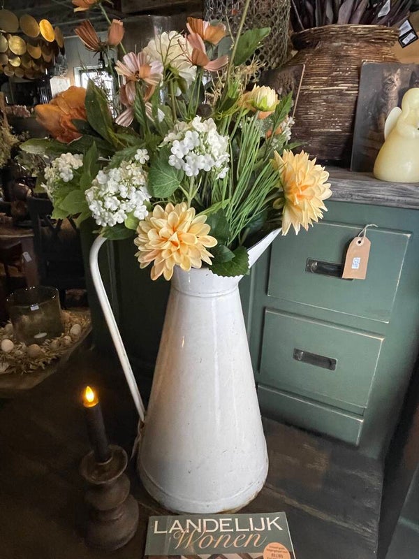 Prachtig kant en klaar boeket van o.a. dahlia/veldbloemen/witte sneeuwbol/eucalyptus in een diversen mix zalm/wit/terra kleur met blad en veldbloemen.